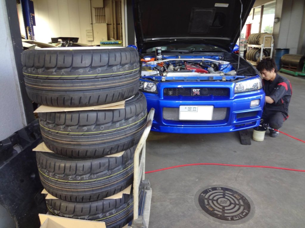 34GT-Rも車検整備中 タイヤはブリヂストンRE11Aに交換